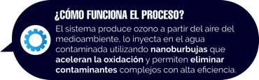The system generates ozone from ambient air and injects it into the contaminated water using nanobubbles that accelerate oxidation, allowing the efficient removal of complex contaminants.